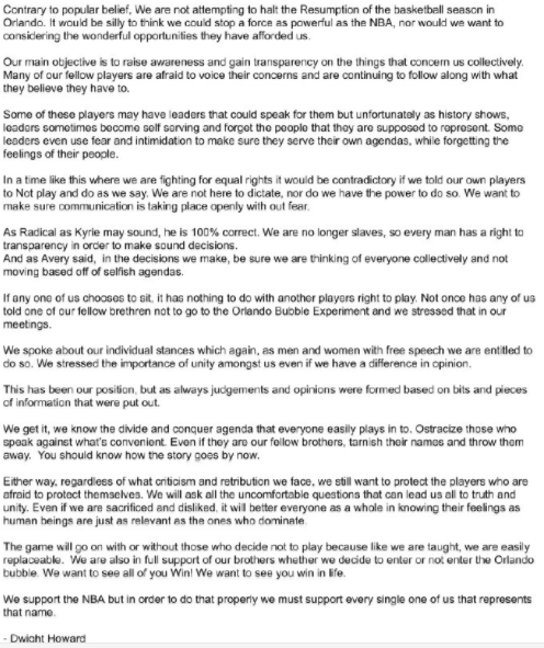 霍华德最新个人声明 态度转变称支持nba 名记透露仍将参赛 牛体育